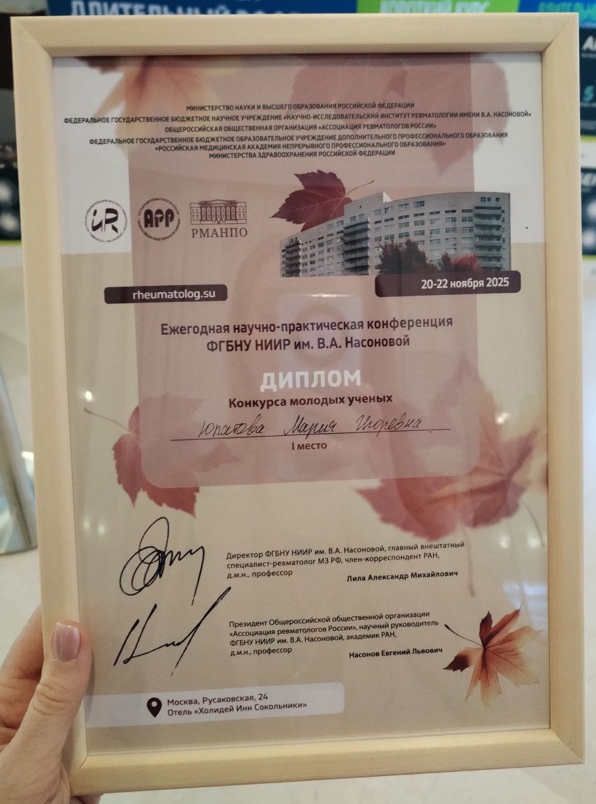 По итогам конкурса молодых учёных среди аспирантов Мария Юпатова, представив работу «Клиническое значение суточного мониторирования артериального давления у пациентов с анкилозирующим спондилитом», заняла первое место.